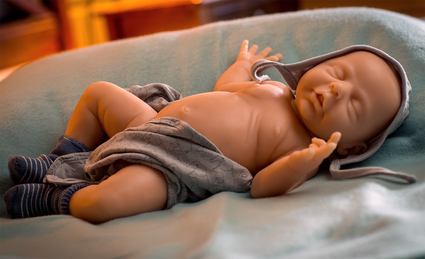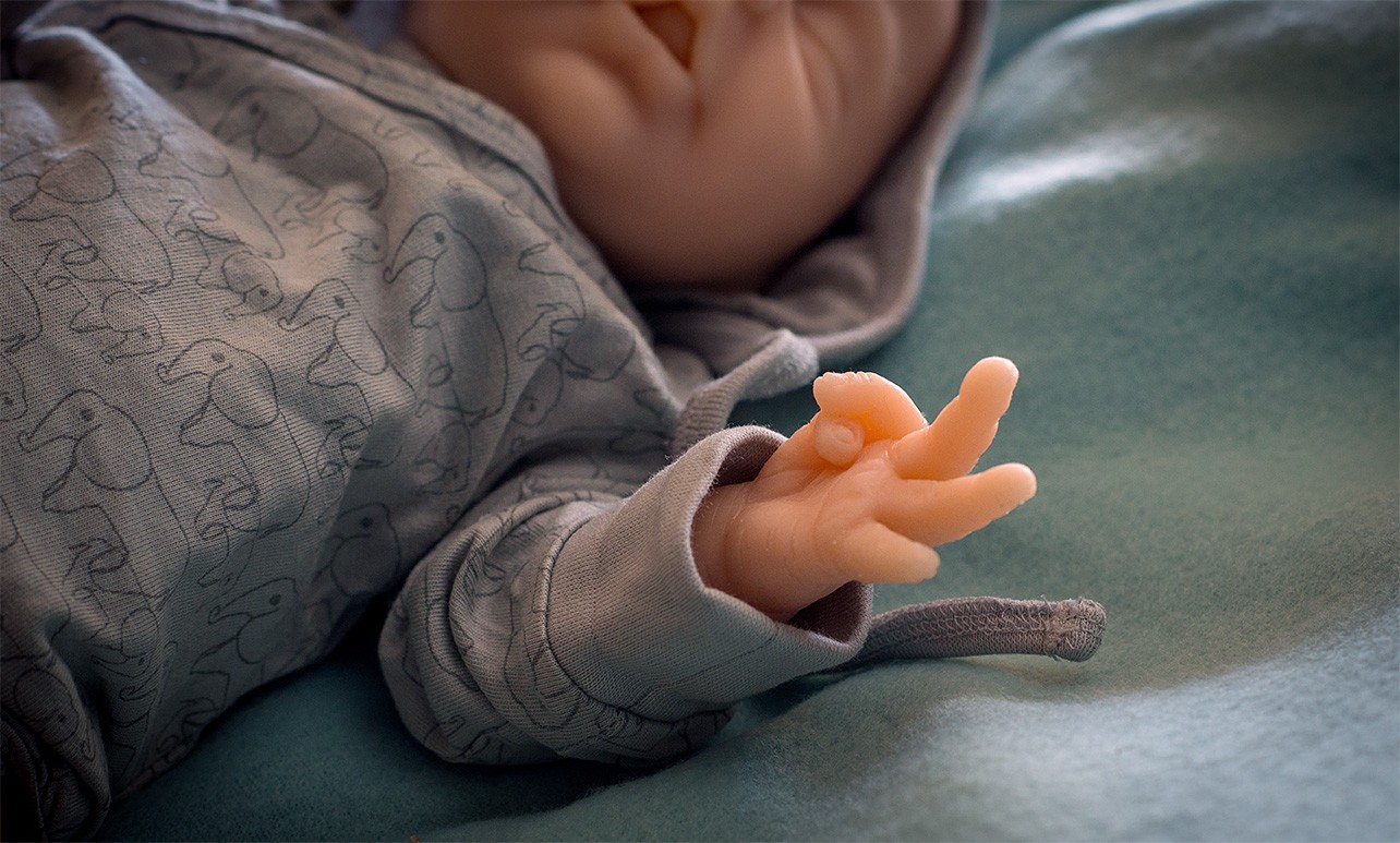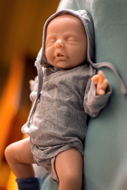 Calimero ist ein schlafendes Baby mit komplett geschlossenen Augen und einem leicht geöffnetem Mund. Da er uns ein wenig die Zunge rausstreckt ist im Auslieferungszustand eine Schnullergabe leider nicht möglich. Er wurde wie unsere Baby Modelle