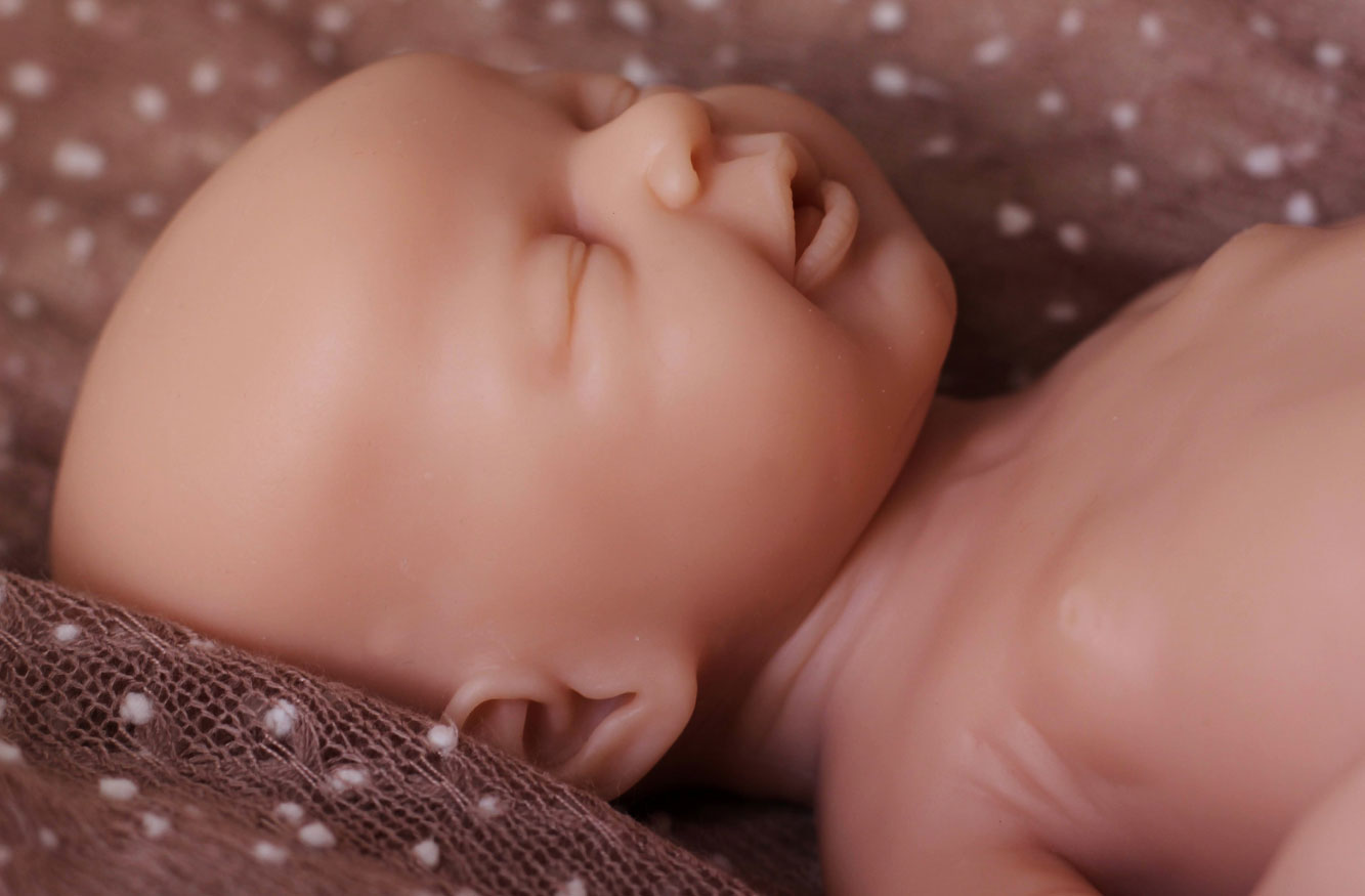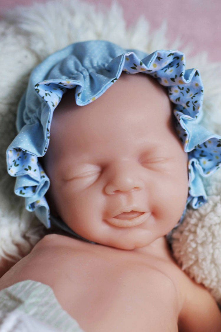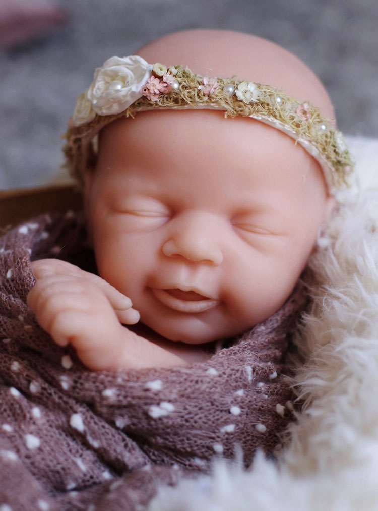 Unsere Leni, modelliert von der renommierten Künstlerin Angela Degner, ist ein großes weibliches Schlafbaby mit geöffnetem Mund und einem zauberhaft friedlichen Gesichtsausdruck. Ihr Mund hat einen detaillierten Gaumen und auch ihre Zunge ist deutlich sichtbar.