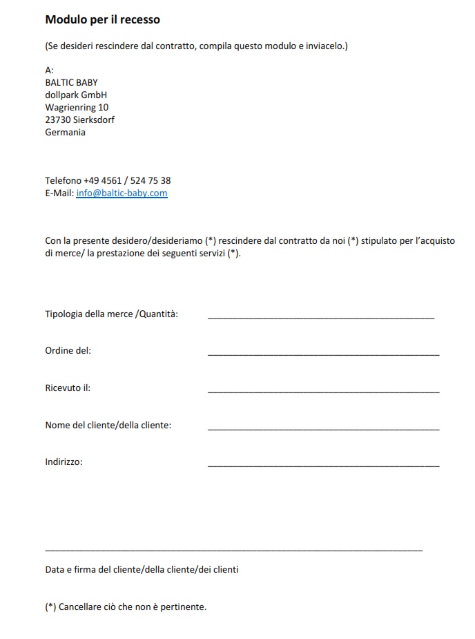 Il contratto di acquisto viene pattuito tra: BALTIC BABY, dollpark GmbH, Amministratore delegato: Michael Wendt, Wagrienring 10, 23730 Sierksdorf